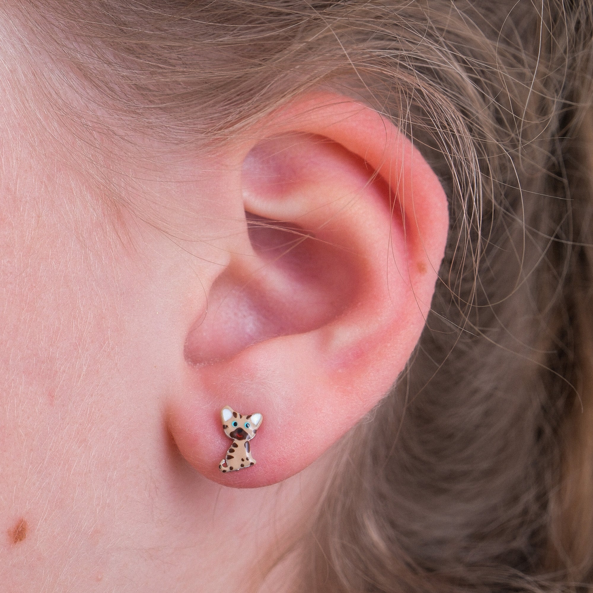These kitten stud earrings are crafted from 925 sterling silver and hand-painted with soft beige and brown enamel details. Each tiny kitten sits playfully, with delicate features that invite a second look. Designed with butterfly backings for secure wear, these earrings are their first symbol of something chosen, something kept. A gentle gift that carries meaning without saying too much.