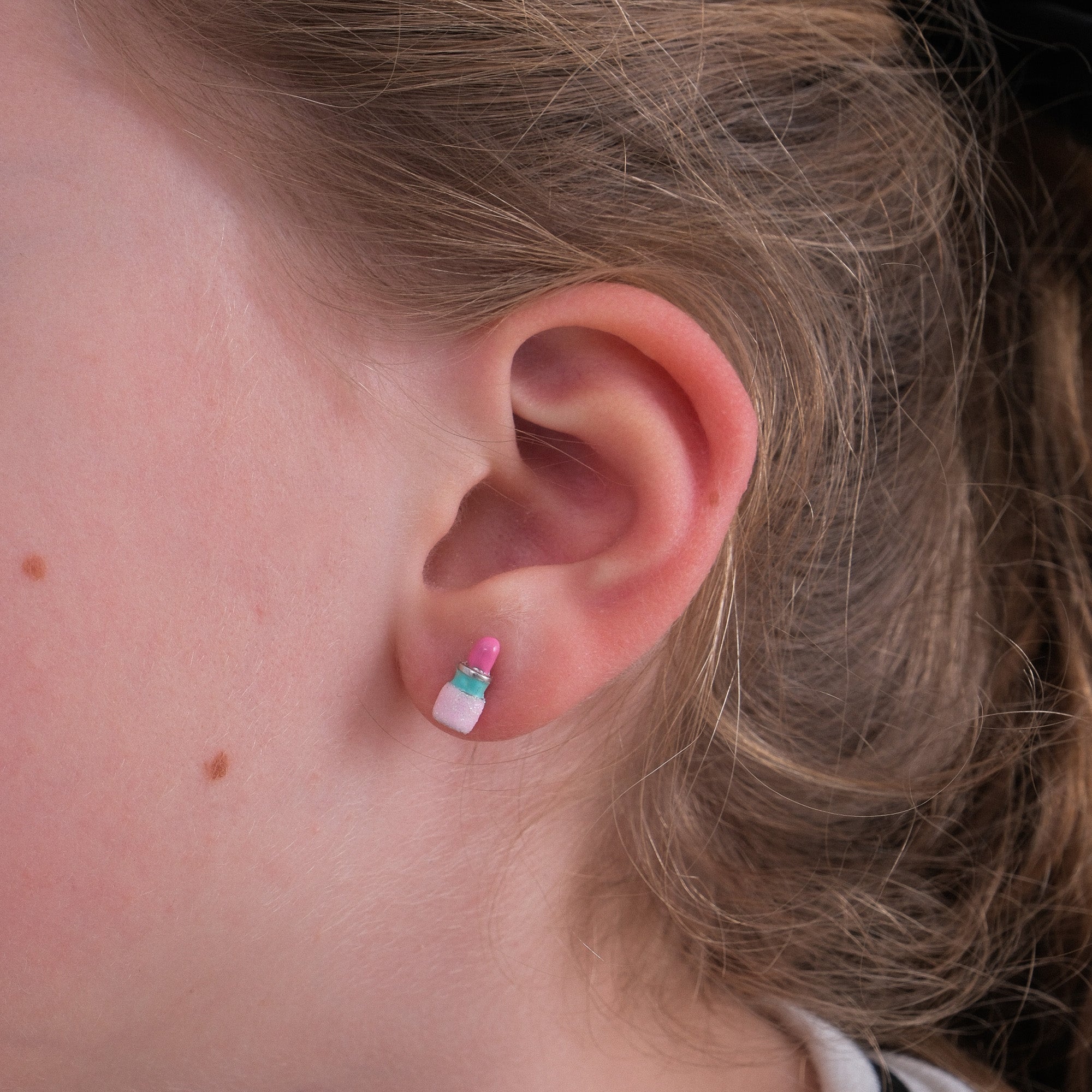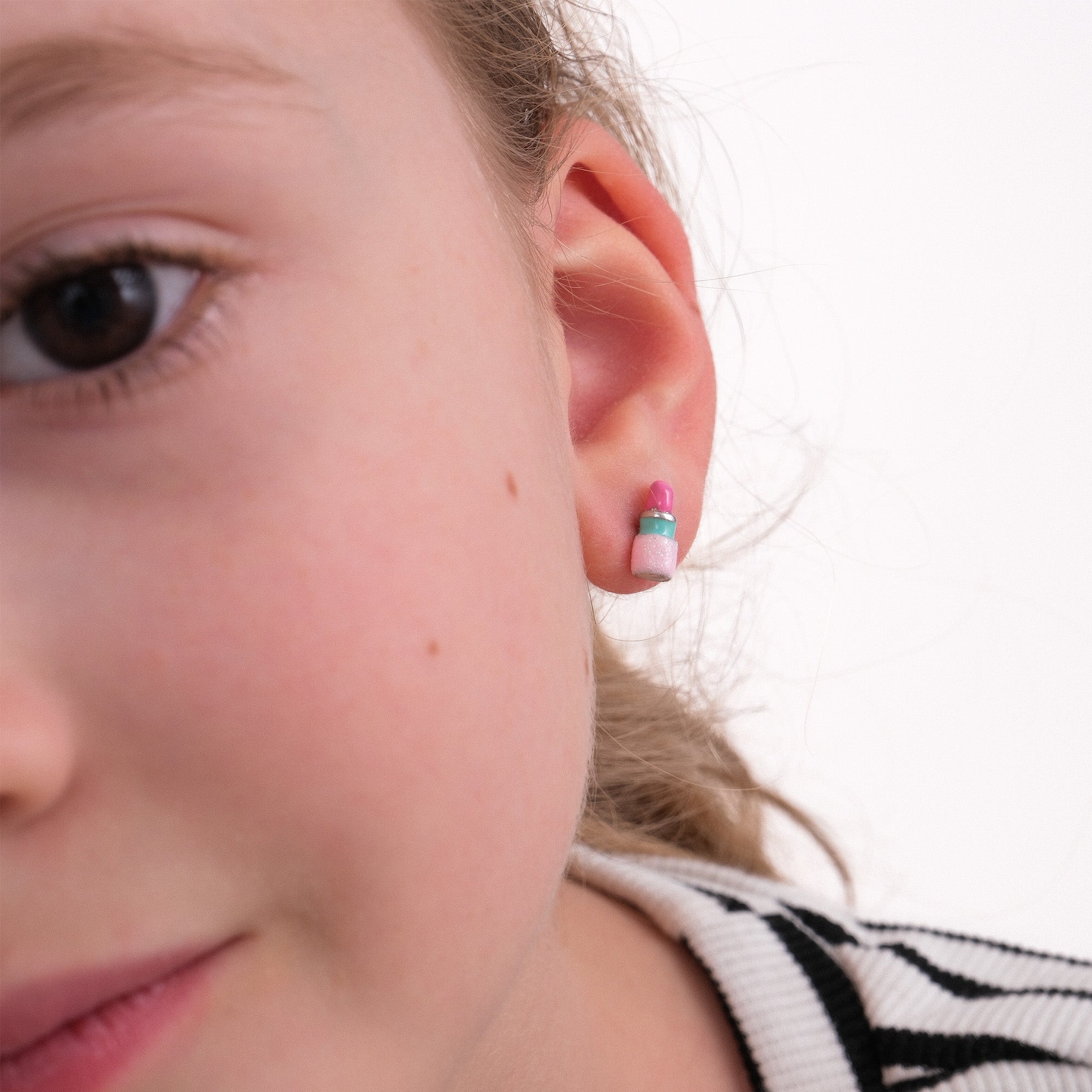 These lipstick stud earrings are crafted from 925 sterling silver, featuring a playful design with pink enamel detailing and a subtle glitter finish. Each earring captures the quiet charm of self-expression, finished with secure sterling silver posts. A piece they'll choose to wear again and again. Created to Be Kept.